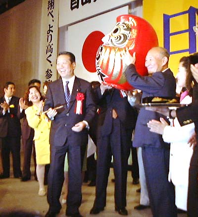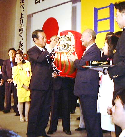 ![]() ![]() 東京都議会選挙、参議院選挙に向け、必勝祈願のだるま目入れ 小沢党首&藤井幹事長